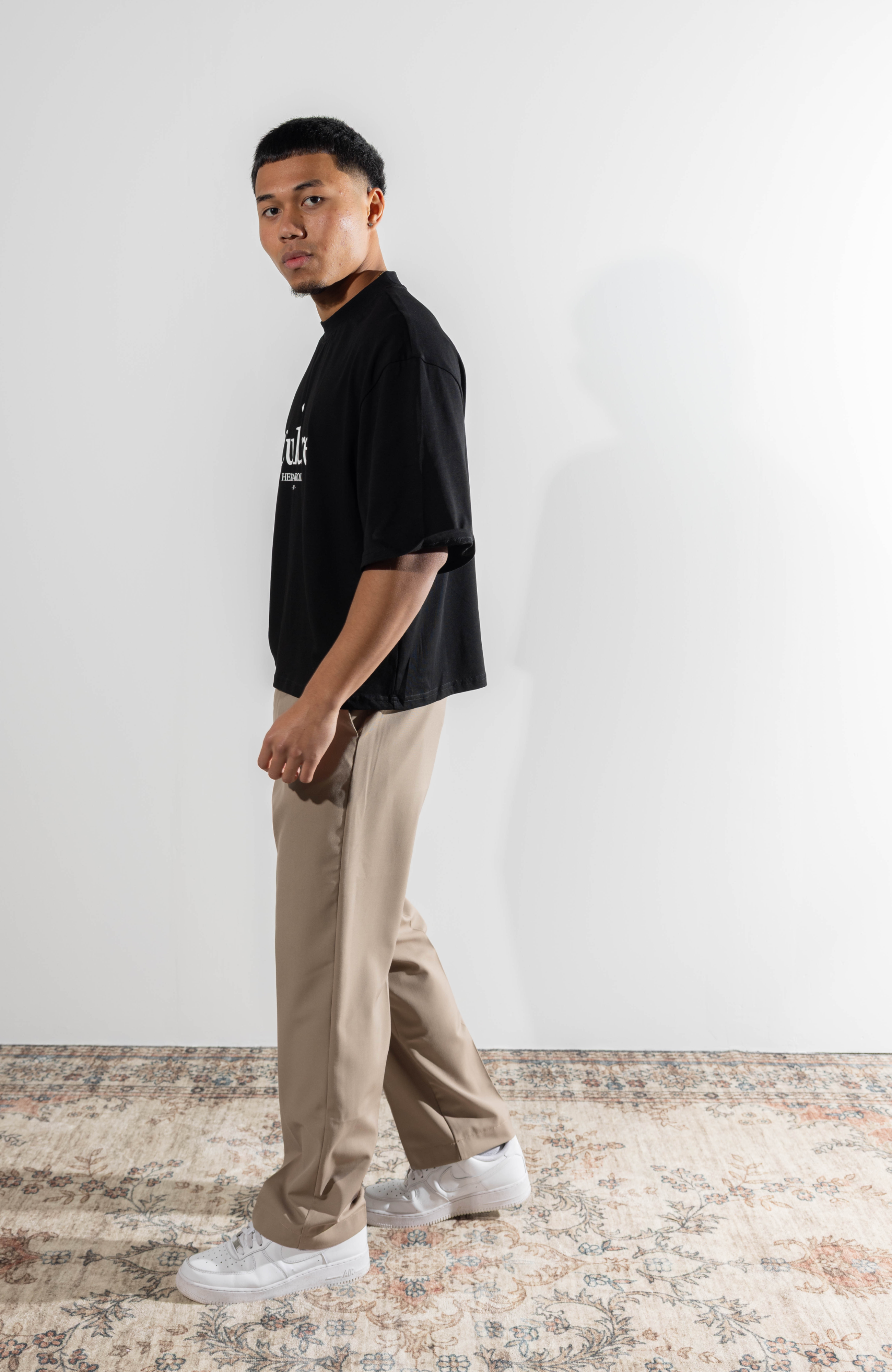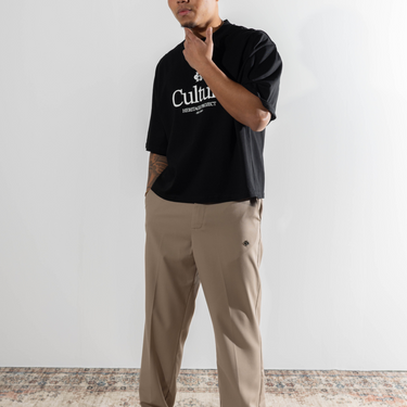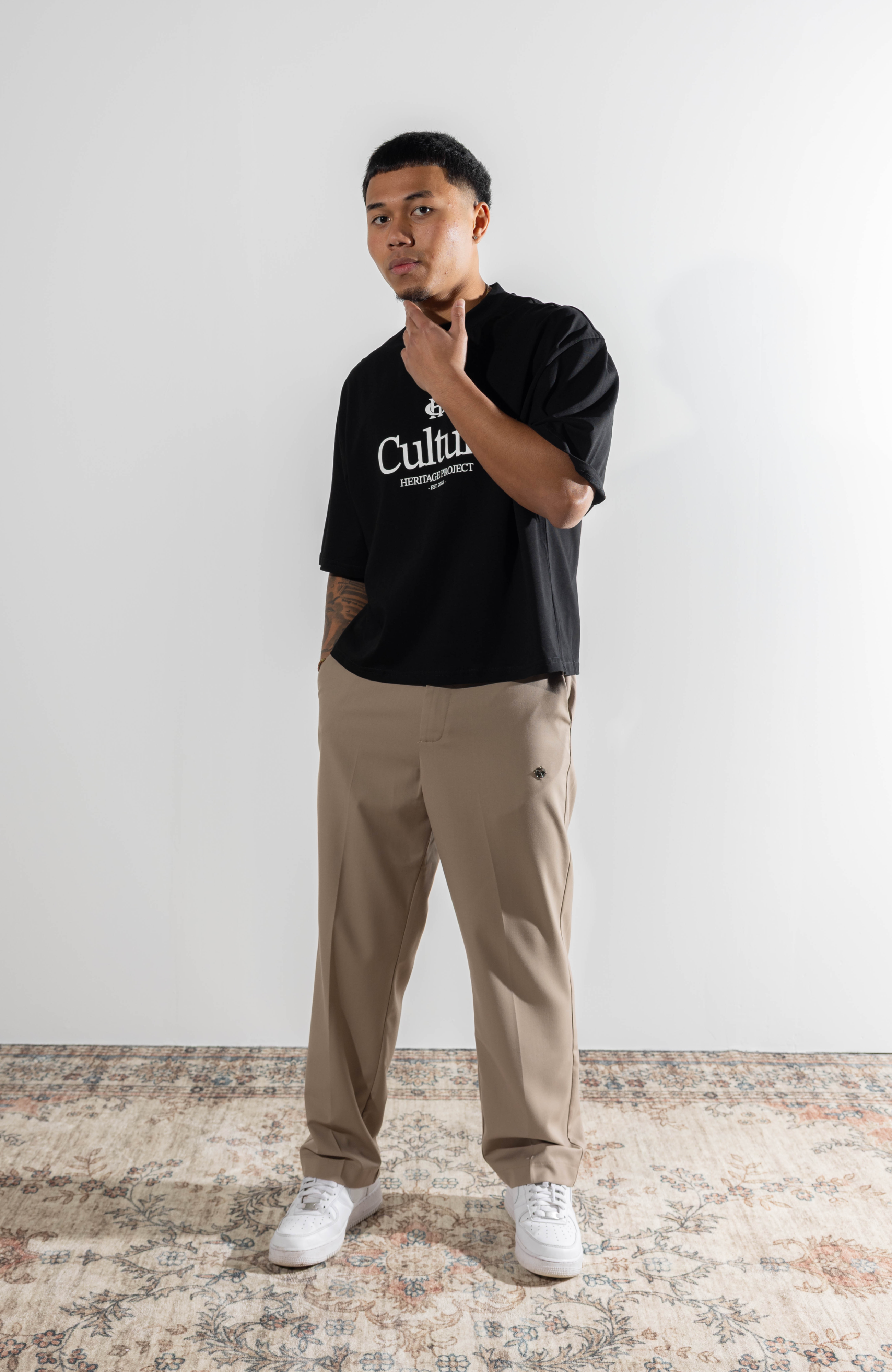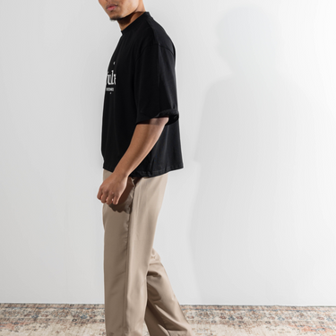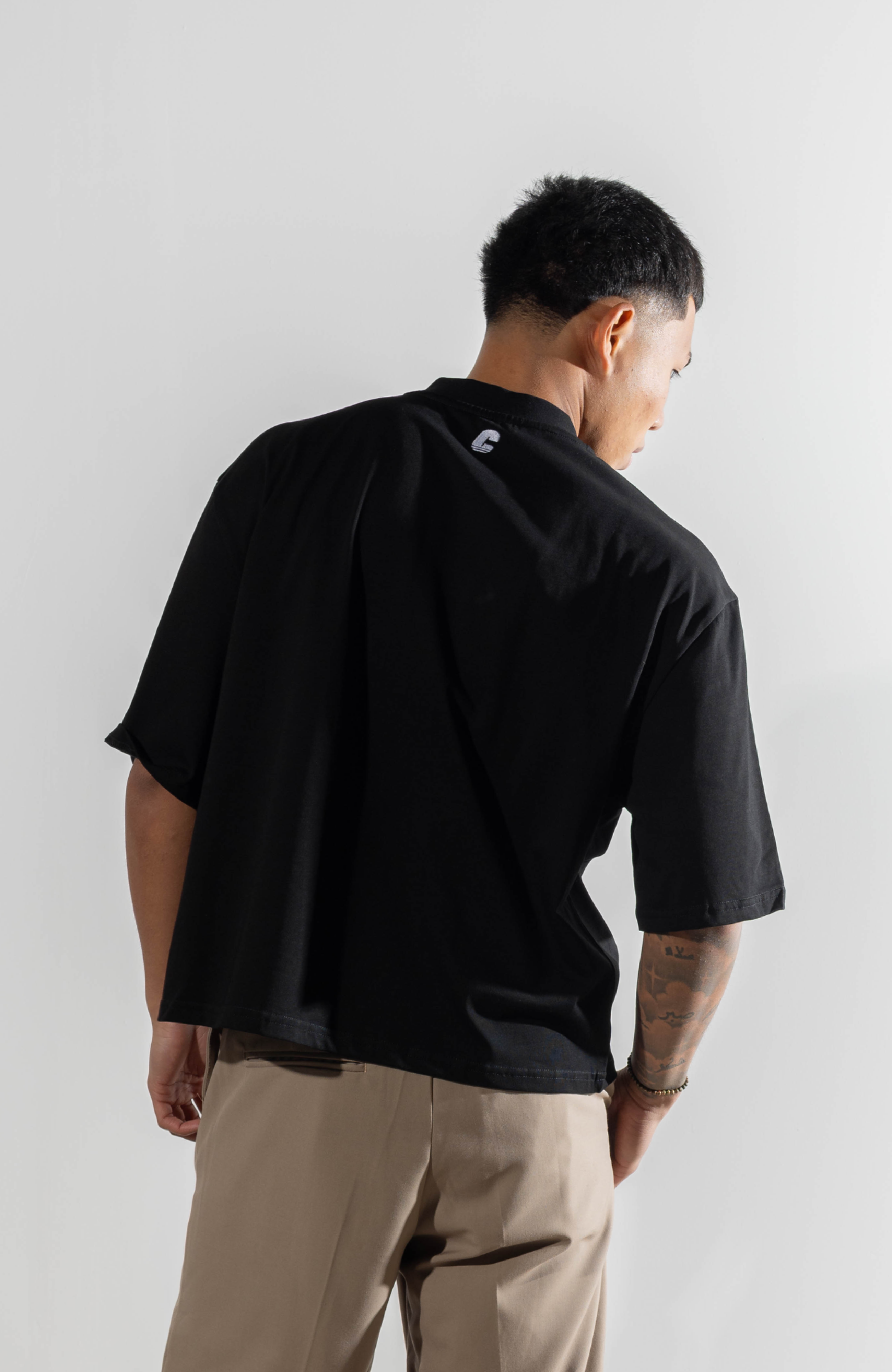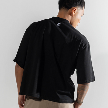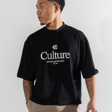 The tee is our new cropped, boxy and oversized fit, with a thick collar. The Sleeves are extended and the length is shorter than the classic Heritage tees.
